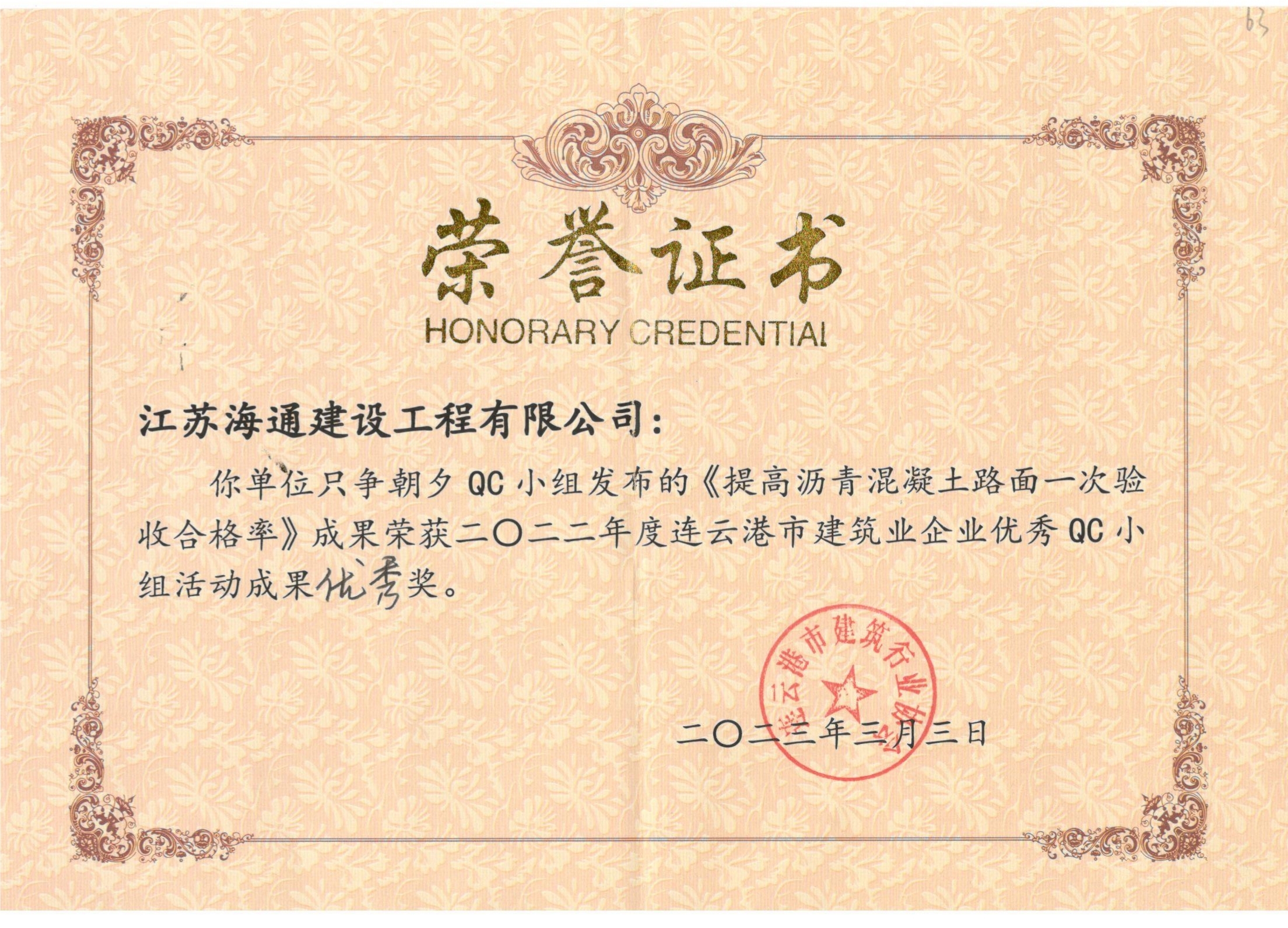 3月3日,連云港市建筑業(yè)協(xié)會舉辦了2022年度連云港市建筑業(yè)優(yōu)秀QC小組活動成果發(fā)布會,全市各行業(yè)共有74項課題成果參加了本次發(fā)布會,海建公司選送的2個QC成果均獲得了市級獎項。
