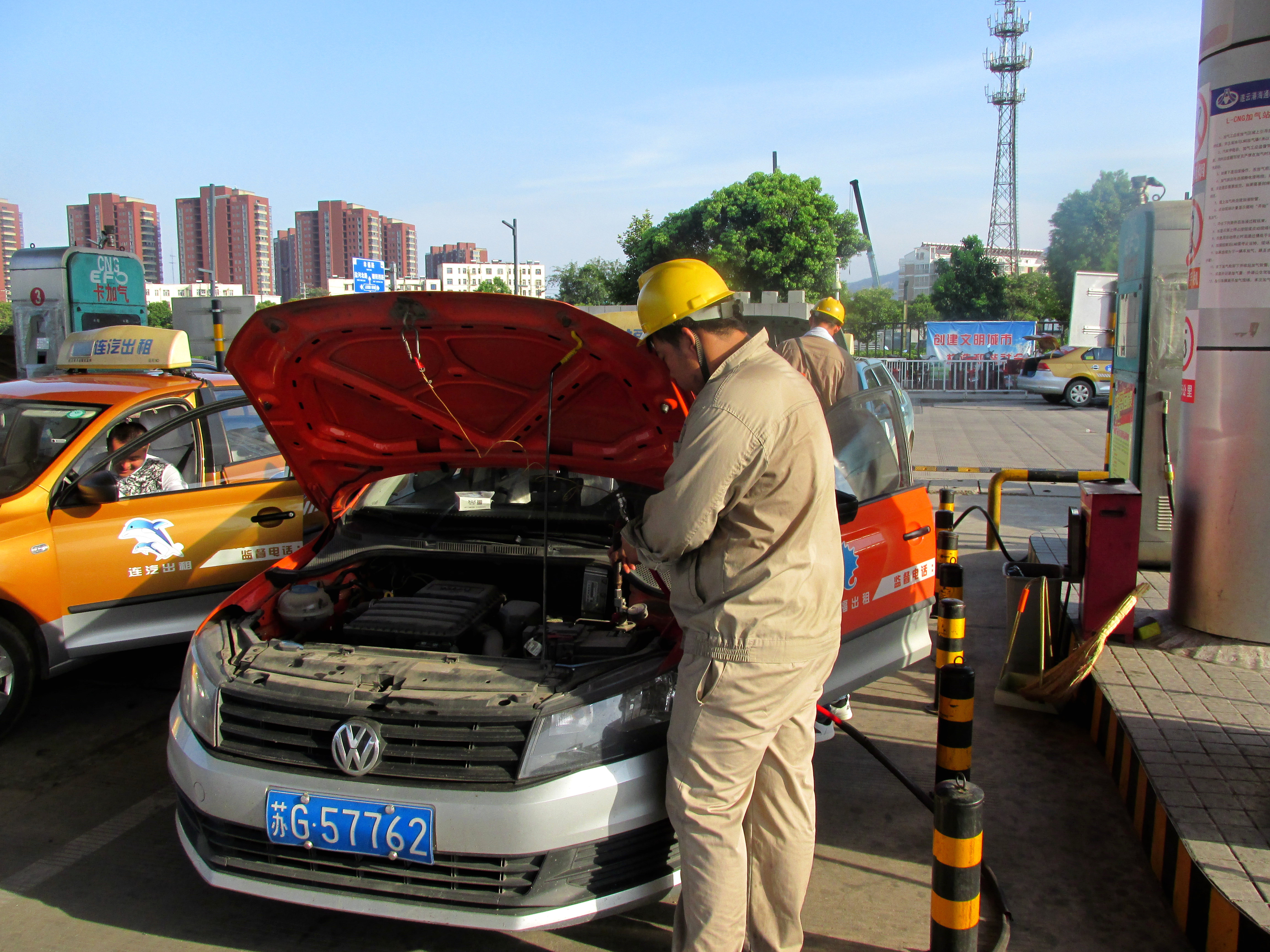 在CNG加氣機旁工作的常銳是個靦腆的大男孩,引導(dǎo)出租車進(jìn)站到指定加氣位置,提醒司機打開前后艙、檢查加氣瓶、通上加氣槍、掛上安全掛鉤,這一套動作常銳再熟悉不過,但是每一次加氣,他都沒有一絲懈怠?!凹託怅P(guān)系到安全,不能有一點馬虎?!闭f話間,常銳把這臺出租車的加氣量和金額進(jìn)行記錄,他指著手背上凸起來幾個包,“這是前兩天我值晚班時候被蚊子叮的,這邊的蚊子厲害得很。”