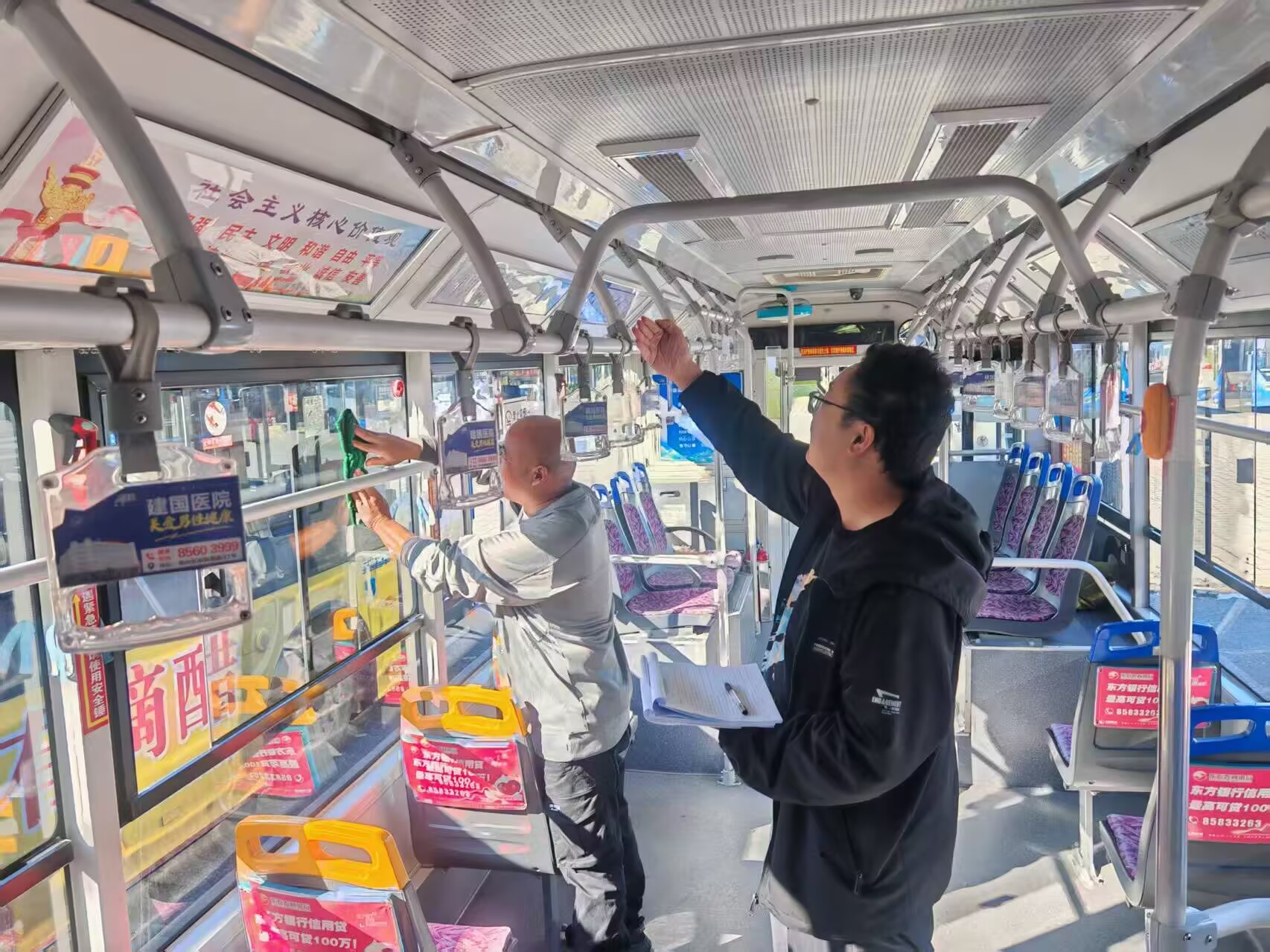 本次檢查堅(jiān)持“全面覆蓋、不留死角”的原則,重點(diǎn)核查車容車貌、車身及車窗清潔度,以及車廂內(nèi)座椅、扶手、地板等關(guān)鍵部位的衛(wèi)生狀況。檢查組還關(guān)注垃圾桶清理情況、通風(fēng)設(shè)施暢通性、車內(nèi)標(biāo)識(shí)完好度,以及扶手、投幣機(jī)等高頻接觸區(qū)域的清潔消毒是否達(dá)標(biāo)。