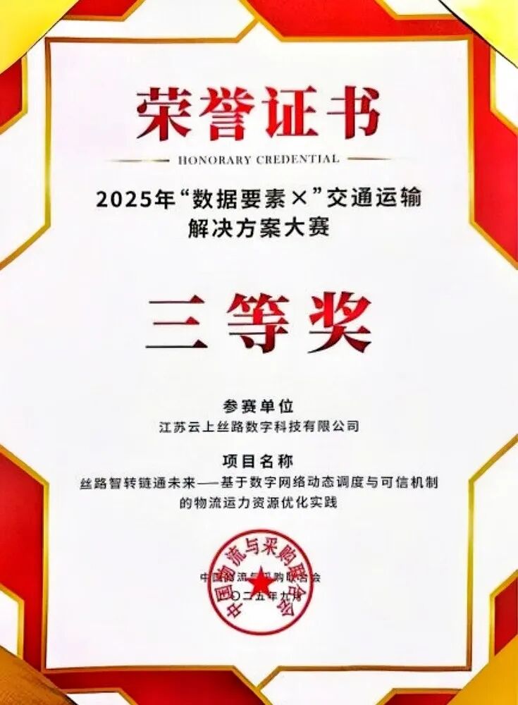 近日,2025中國物流與采購聯(lián)合會“數(shù)據(jù)要素×”交通運輸解決方案大賽全國總決賽在上海落幕,江蘇省物流產業(yè)促進會副會長單位——江蘇云上絲路數(shù)字科技有限公司憑借“絲路智轉鏈通未來——基于數(shù)字網(wǎng)絡動態(tài)調度與可信機制的物流運力資源優(yōu)化實踐”項目,獲大賽三等獎。