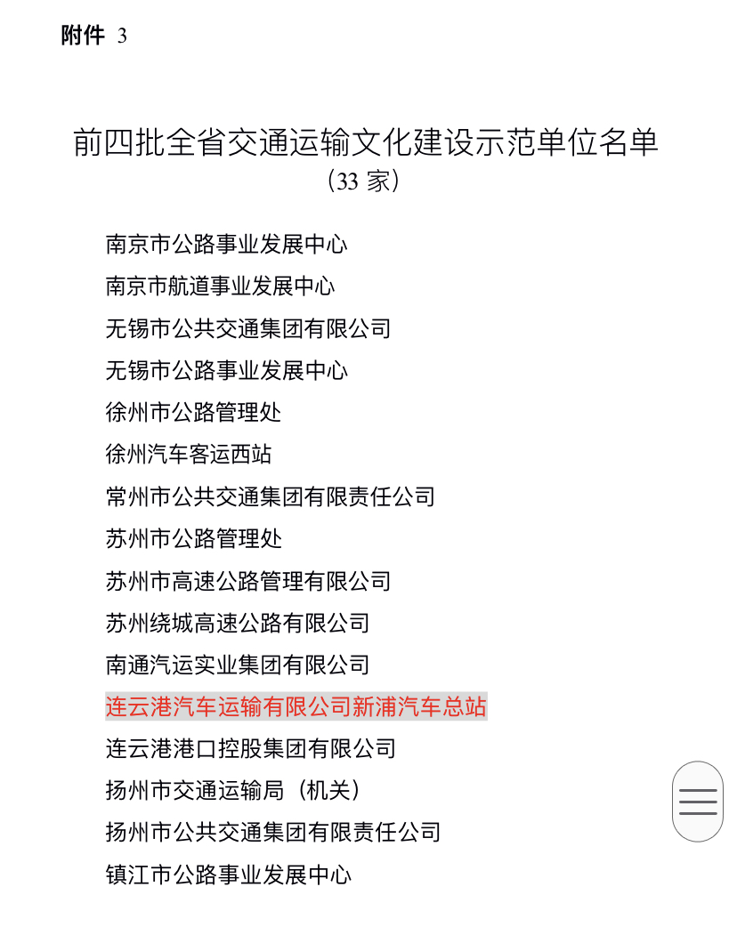 近日,省交通運(yùn)輸廳開(kāi)展第五批全省交通運(yùn)輸文化建設(shè)示范單位申報(bào)評(píng)選及復(fù)核認(rèn)定工作。新浦汽車(chē)總站作為連續(xù)四年江蘇省運(yùn)輸文化建設(shè)示范單位榮譽(yù)獲得者,將繼續(xù)發(fā)揮示范引領(lǐng)作用,在文化建設(shè)實(shí)踐中再創(chuàng)佳績(jī)。