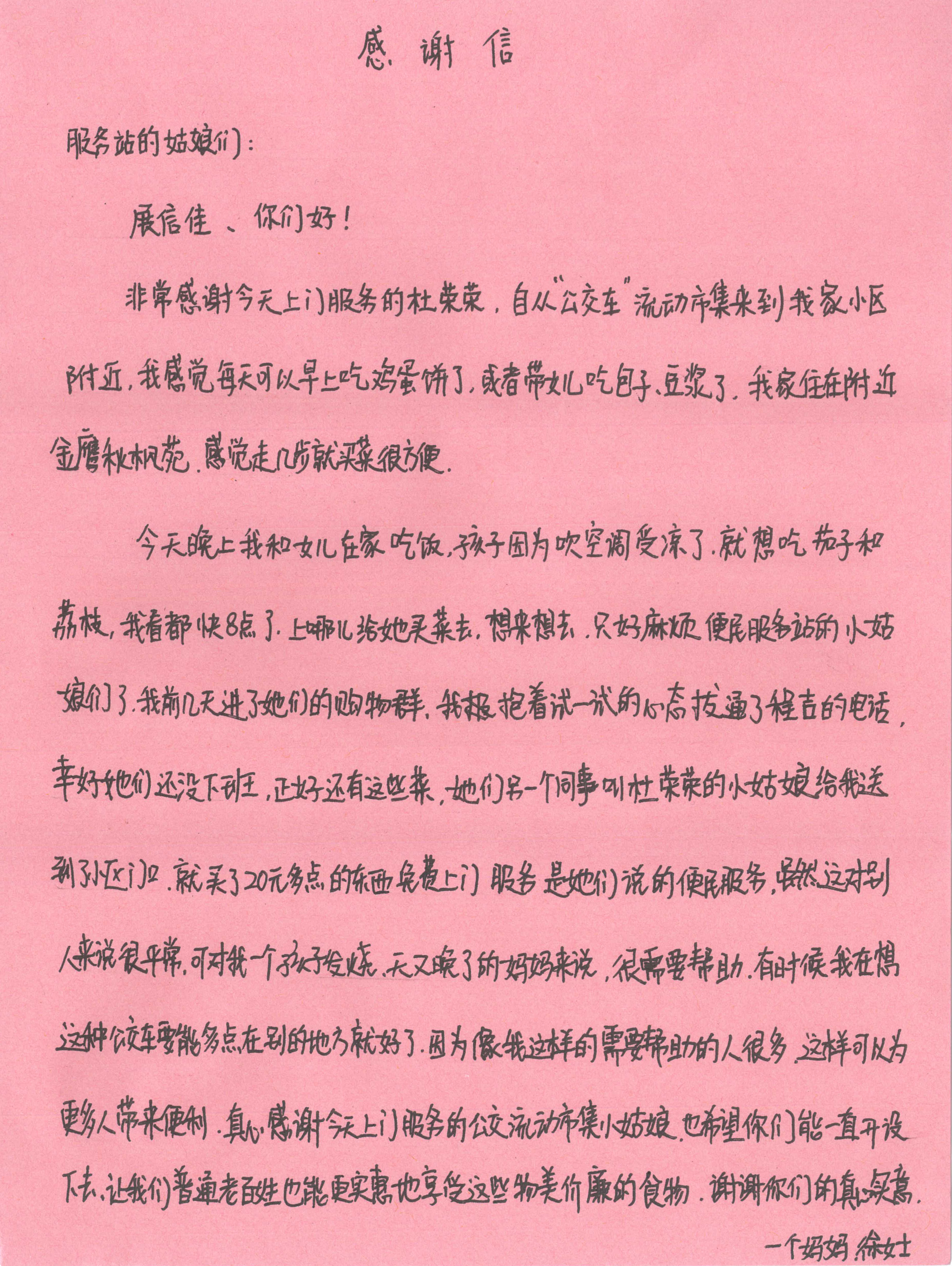 6月11日晚八點左右,便民服務點的營業(yè)員程吉接到了市民徐女士的微信語音“求助”電話。原來,家住附近的徐女士獨自在家照顧生病的孩子,孩子想吃新鮮的荔枝和茄子,她便詢問市集是否還有存貨,能否送來。程吉了解情況后,立即安排同事杜榮榮將水果和茄子送到徐女士所在的小區(qū)門口。次日早晨,徐女士專門帶著她手寫的一封感謝信來到市集,密密麻麻的一張紙上表達了她對公交流動市集的感激之情,她稱贊市集給她帶來了便利與實惠。在信中,她希望這樣的流動市集能夠遍布連云港的每一條街道,為更多人帶來方便。